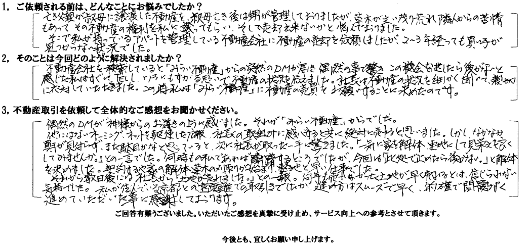 それから数日後には担当者から「土地が売れました。」との一報。何年も売れなかった土地が速く売れるとは信じられない気持ちでした。私が住んでいる京都との遠距離での取引きでしたが、進め方はスムーズで早く、的確で問題なく進めていただいた事に感謝しております。